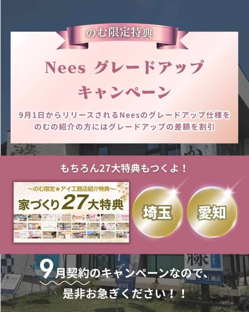 愛知県と埼玉県の方限定で、のむの紹介特典として、アイ工務店の新仕様分を値引き対応してくれます!!(2025年9月契約限定)