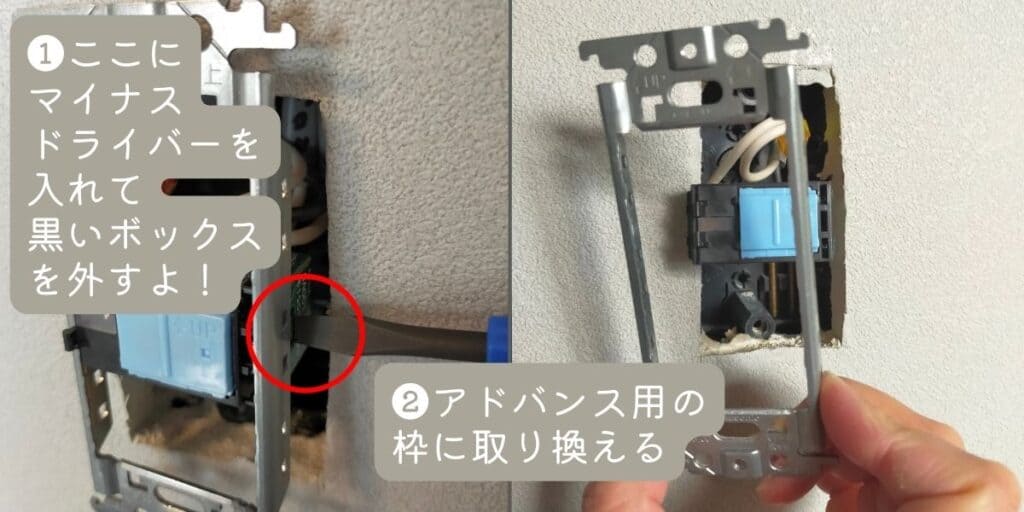 マイナスドライバーを右側に入れて黒いボックスを外します。そして、アドバンス用の枠に取り換えます。