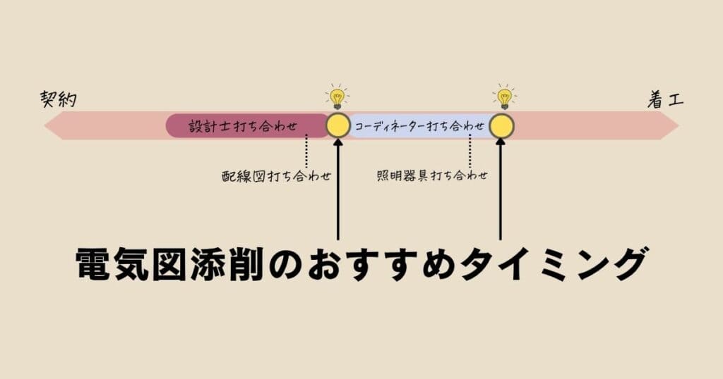 タイミングとしては設計打ち合わせ後からインテリア打ち合わせの間、もしくはコーディネーターと照明機器の打ち合わせをした後くらいで添削をしてください。